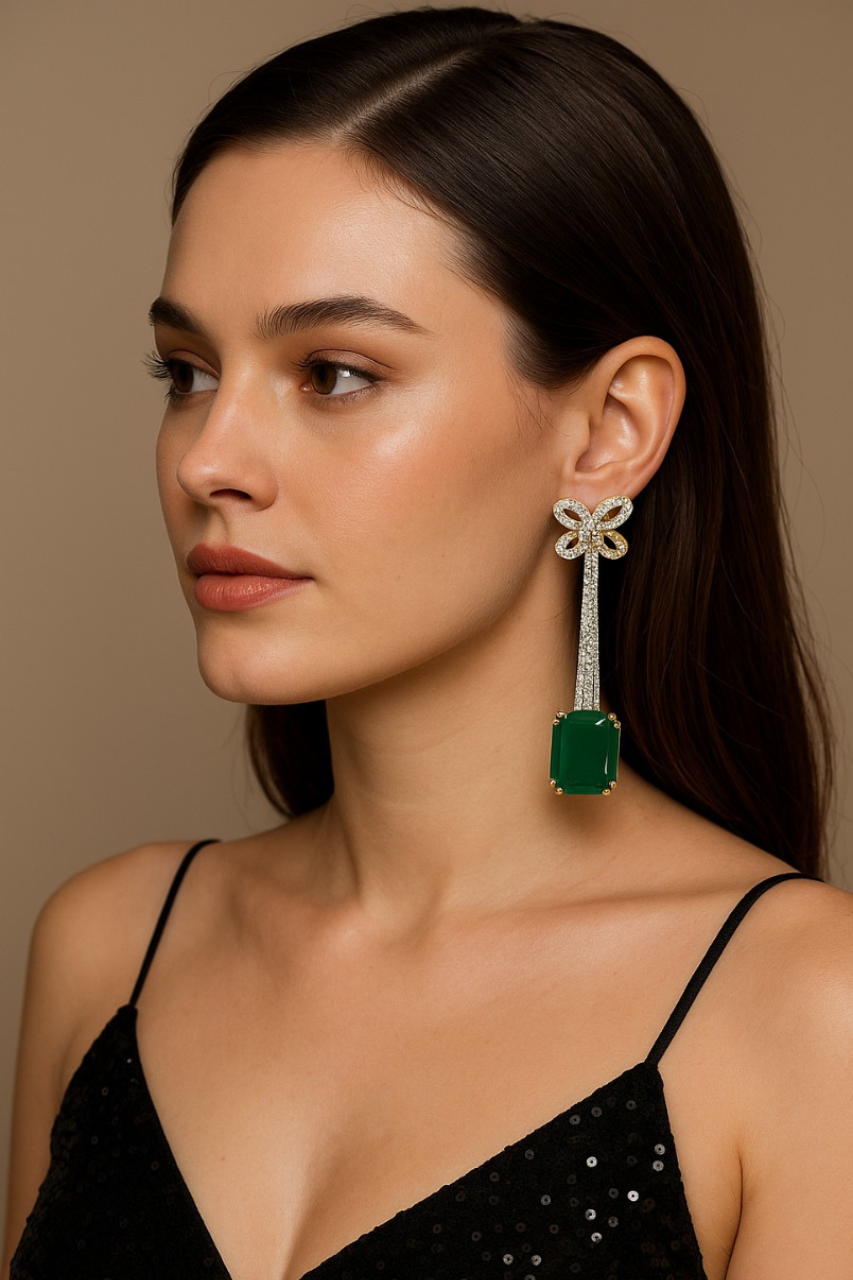 KYAAPEH Bollywood-style Long AD Earring design with Emerald stone exude timeless elegance, ensuring you stand out in every crowd.