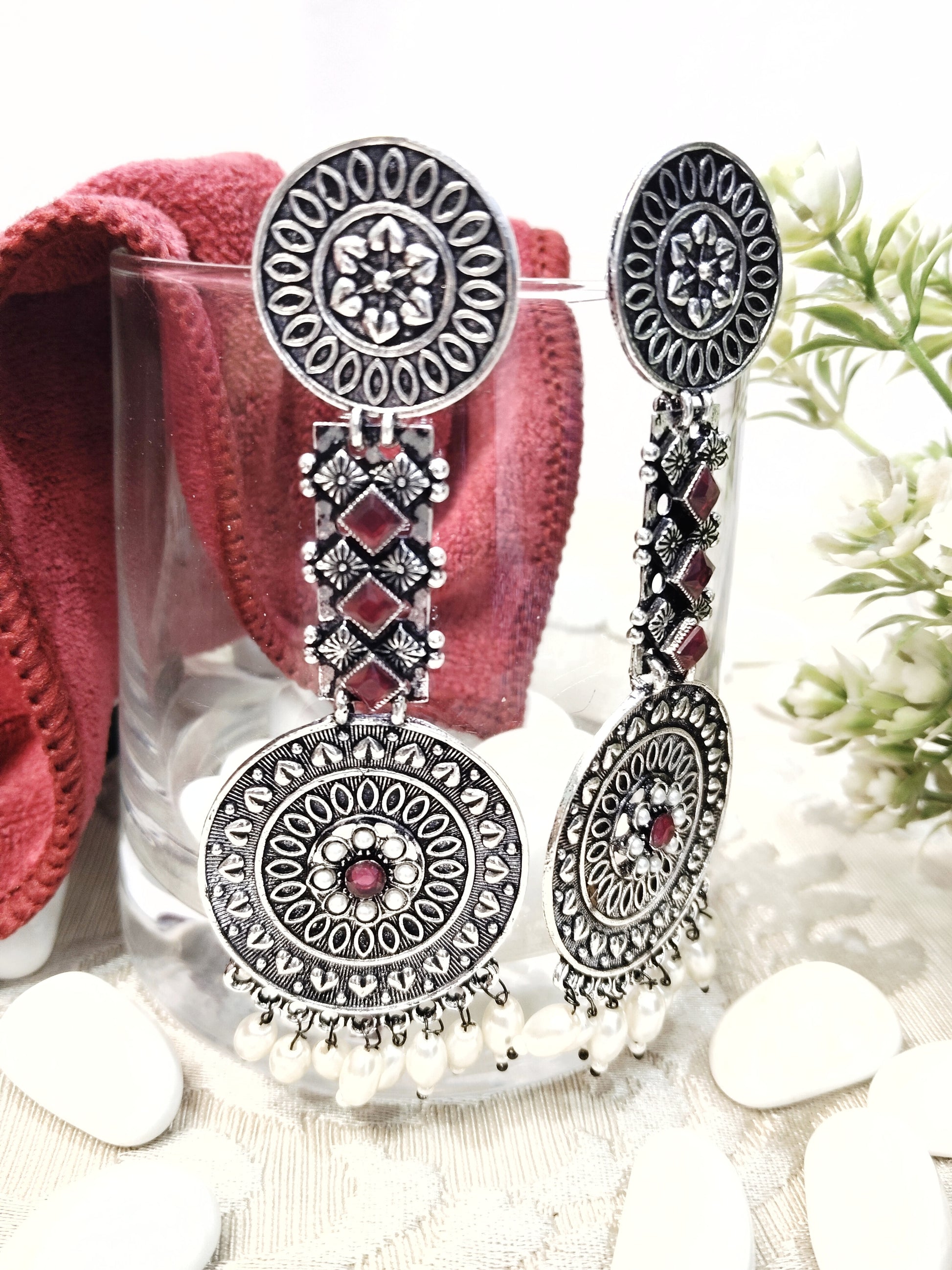 Channel your inner Bollywood queen with this elegant oxidized long earrings, featuring intricate metalwork, vibrant ruby stones, and delicate dangling pearls. This ear ring is a perfect match for the requirement of designer Indo-western earrings for women/girls. This earring is also a perfect match for weddings, festivals, or any special occasion.