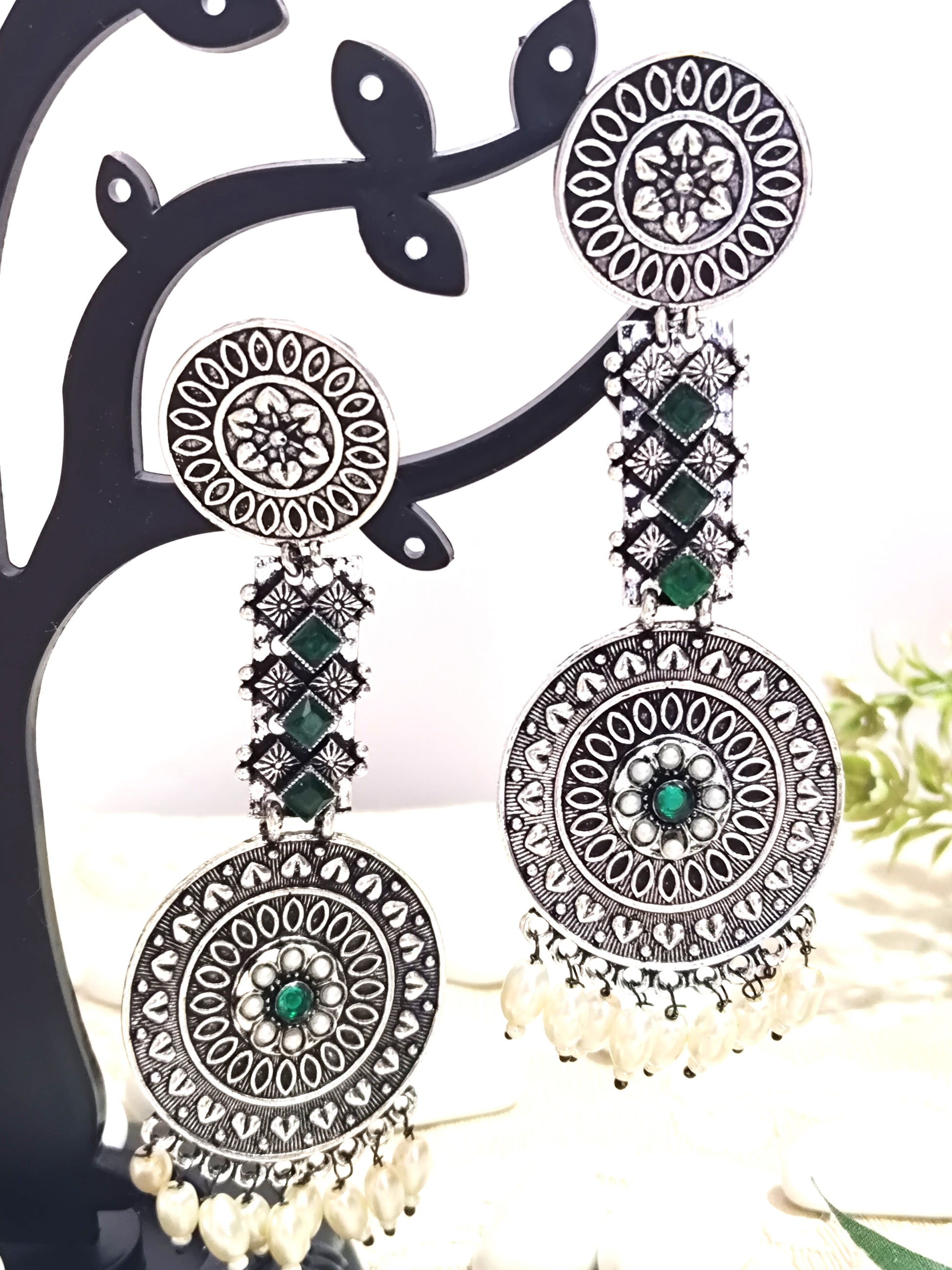 Channel your inner Bollywood queen with this elegant oxidized long earrings, featuring intricate metalwork, vibrant emerald stones, and delicate dangling pearls. This ear ring is a perfect match for the requirement of Designer Indo-western earrings for women/girls. This earring is also a perfect match for weddings, festivals, or any special occasion.