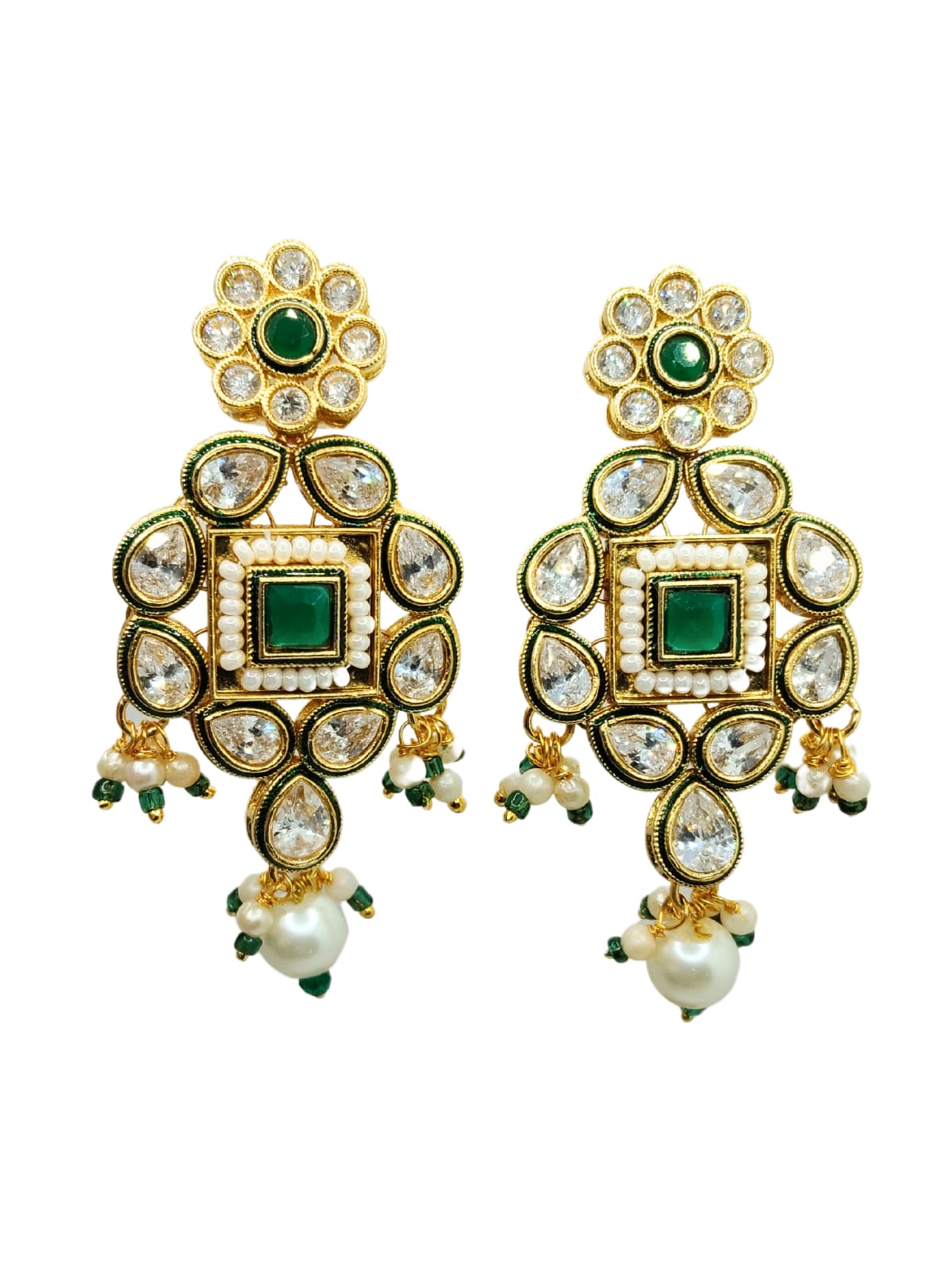 KYAAPEH Add royal elegance to your look with these stunning Gold Plated Kundan Dangler Earrings, embellished with Green and White American Diamonds and finished with delicate pearl danglers. A perfect blend of tradition and glamour, ideal for festive wear, weddings, and bridal occasions.