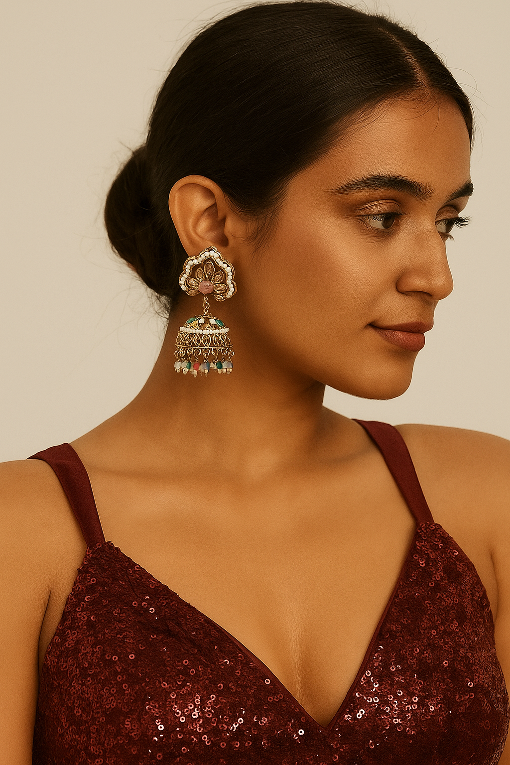 Pair these jhumkas with a silk saree, lehenga, or even an Anarkali suit. For a fusion twist, wear them with a solid maxi dress or Indo-western co-ord set.