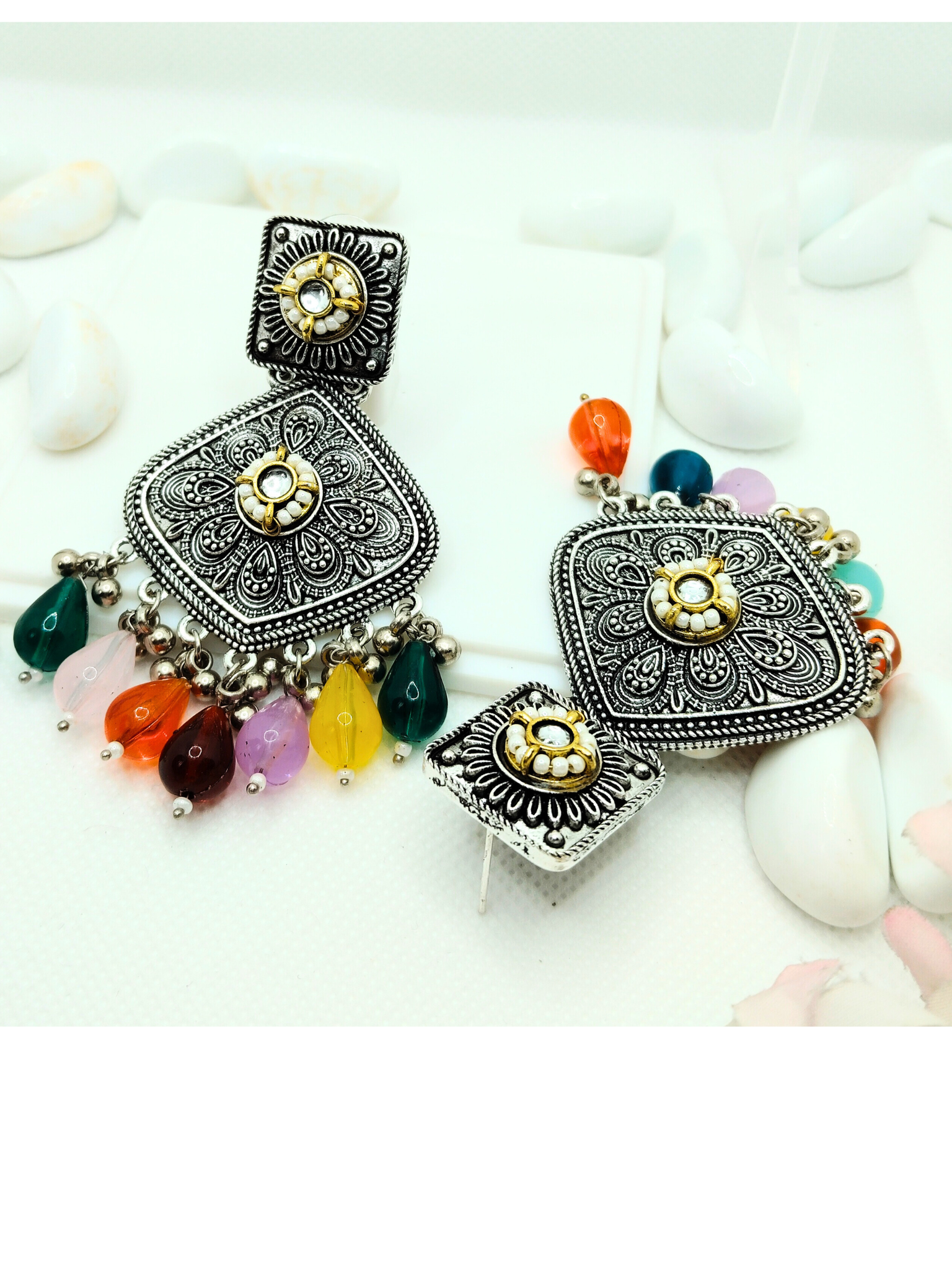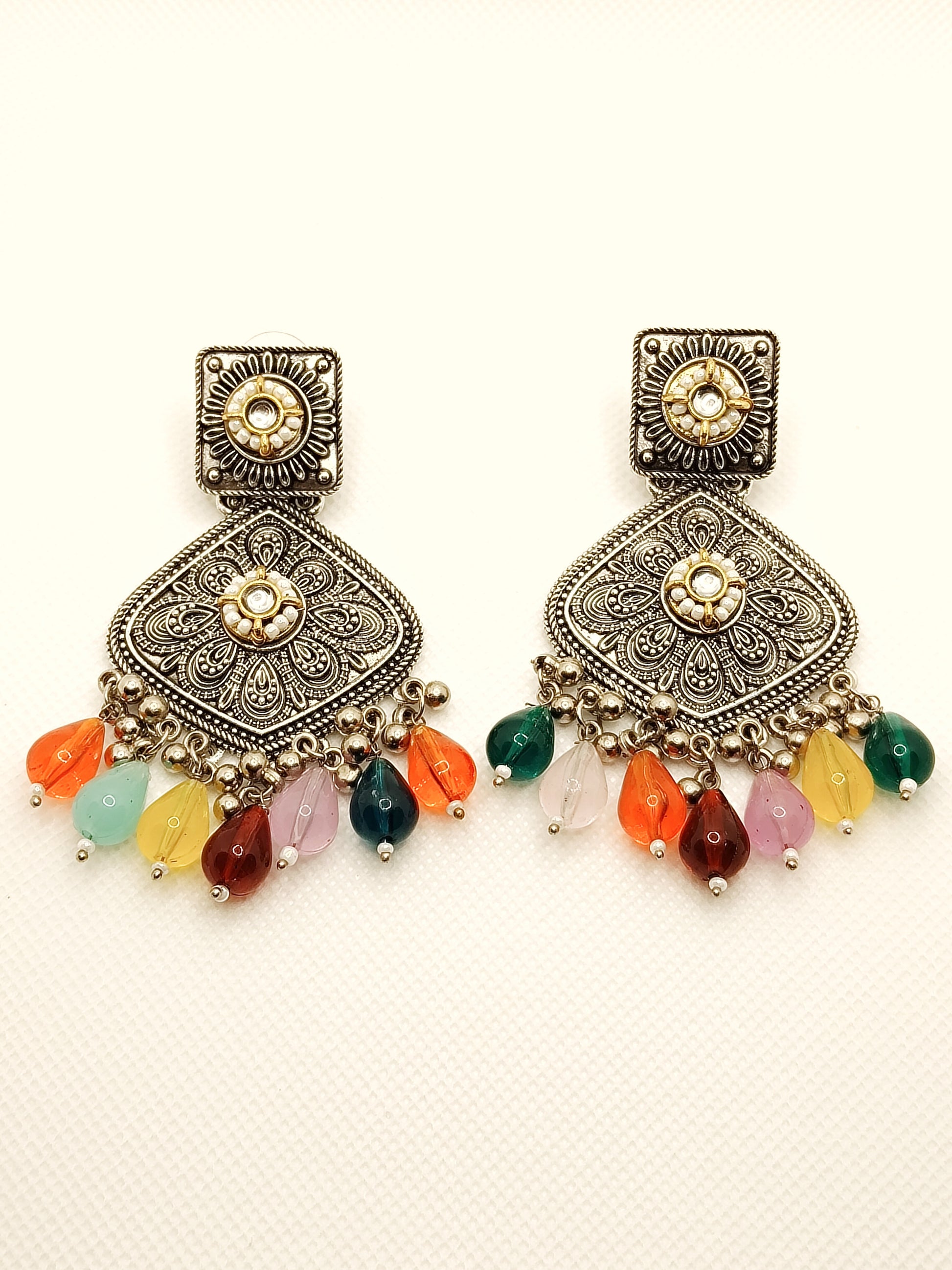 KYAAPEH adds a touch of Bollywood elegance to your ensemble with these lightweight oxidized dangler earrings featuring pearls and vibrant multicolor beads. Perfect for festive occasions or casual chic looks. These earrings exude traditional charm with a playful twist.