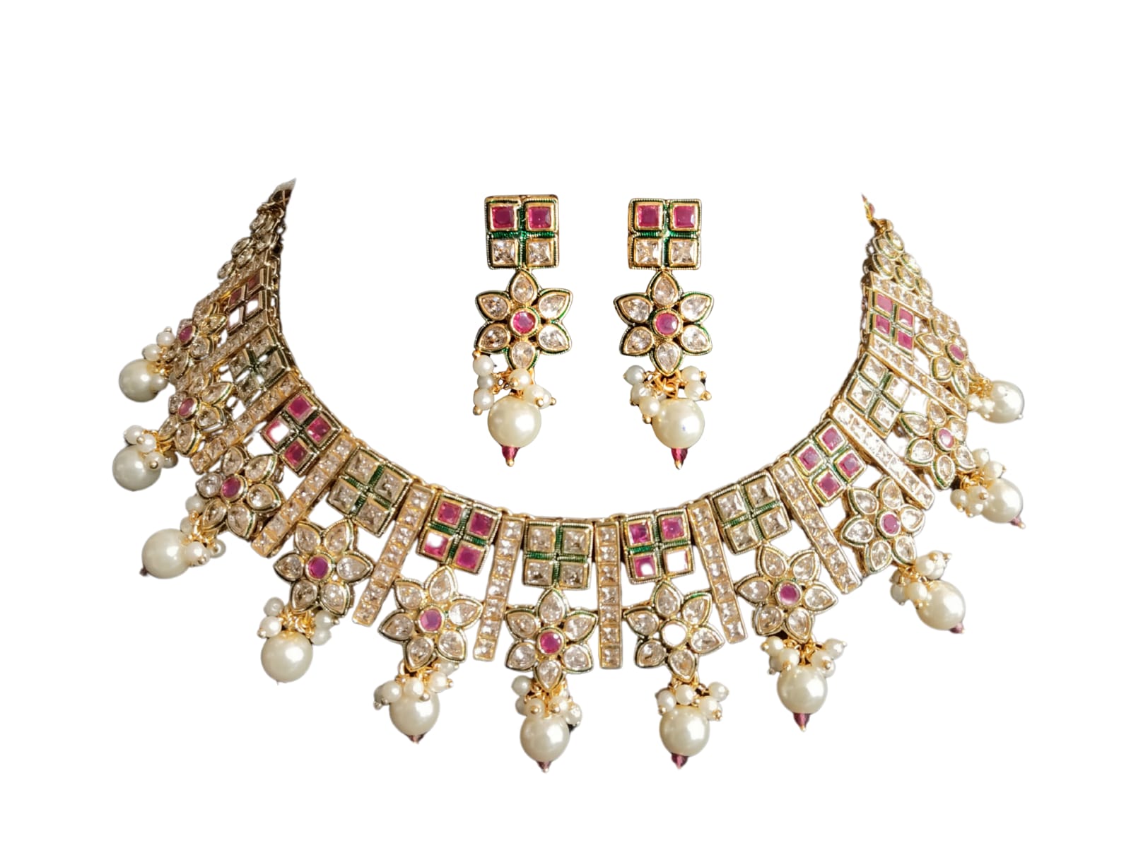 Elevate your ethnic look with this exquisite gold plated Kundan choker set, featuring green Meenakari work, ruby stones, sparkling white American diamonds, and elegant pearl danglers. This handcrafted jewelry set includes matching earrings, perfect for weddings, festivals, or special occasions.